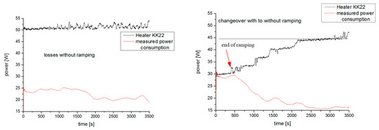 The measured heat losses [W] in the first SIS100 BPL series module, measured at a temperature of 4.5 K for a static condition (left) and for a transition from a dynamic load (ramping) of superconducting busbars to a static condition (right).