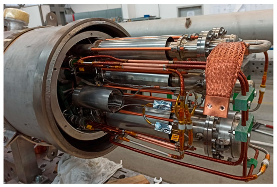 Electric power and liquid helium are provided to sections of the bypass line by short feed-in lines from three feed boxes, one per two sectors. The electric power is transferred from feed boxes by the NbTi superconducting busbars, cooled by a two-phase liquid–vapor mixture of helium. The required helium mass flow adjustment is done by isenthalpic throttling in a capillary [8]. A cross-section of the NbTi superconductor is shown in Figure 3. The outer superconducting wires are cooled by the helium flowing through the central CuNi tube. Details of the cable structure are given in [9].
