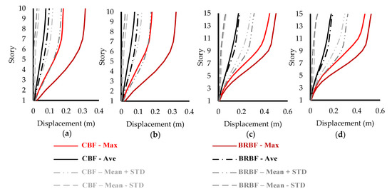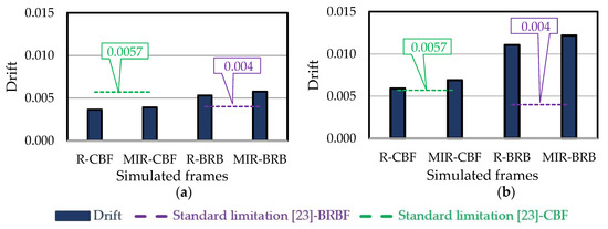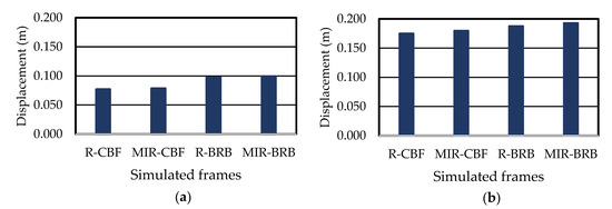 - The maximum displacement of the top floor is higher in the frames with BRBs than in those with CBFs.