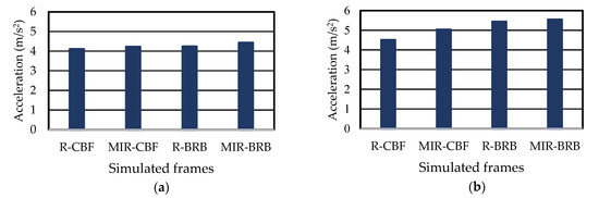 - An earthquake with the highest PGA among all the selected records imposes the highest acceleration on the top floors of all the eight frames. The maximum acceleration is also reported in the 10- and 15-story MIR-BRBFs.