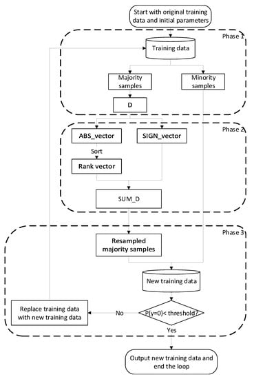 Among all the data resampling methods, random over-sampling and random under-sampling are the simplest resampling methods for rebalancing datasets []. Although random sampling methods have some defects, they indeed improve the performance of classifiers. To avoid the drawbacks caused by random methods, researchers attempt to generate new synthetic samples based on original dataset and attain to great success. SMOTE [] is one of the most classical methods among synthetic over-sampling methods. Numerous methods are proposed based on SMOTE, like ADASYN [], Borderline-SMOTE [], MWMOTE [], Safe-level-SMOTE []. The generated samples add essential information to the original dataset so that the additional bias to classifier can be alleviated and the overfitting problem to which random over-sampling might lead can be avoided [].