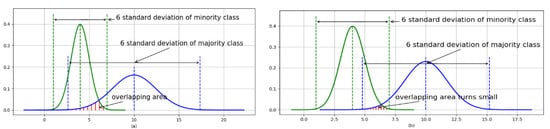 Figure 2 presents two curves in each figure which mean the probability density functions of two probabilities in one dimension, respectively. It is known that samples in overlapping area are hard to be classified correctly and may disturb model training. The data distribution of original dataset in one dimension is like curves in Figure 2a, the distribution of majorities is dispersive and creates a large overlapping area with minorities. After removing less informative samples in majorities, the variance of majorities turns small and the overlapping area turns smaller as well in Figure 2b. The two figures illustrate that the increase of sample variance of one class would lead sample overlapping area larger and make the learning phase harder to classify. Considering the amount of majority samples in datasets with imbalanced distribution is larger than minority samples, we define an informative variable D for evaluating how informative a majority sample is for one feature.