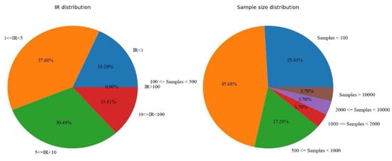 Datasets we choose in this research are software defect datasets from Marian Jureczko Datasets [], NASA MDP datasets from Tim Menzies [] and Eclipse bug datasets from Thomas Zimmermann [] as benchmark data. Datasets in the first two research can be obtained from the website (https://zenodo.org/search?page=1&size=20&q=software%20defect%20predictio) and the Eclipse bug datasets are downloaded from Eclipse bug repository (https://www.st.cs.uni-saarland.de/softevo/bug-data/eclipse/). We investigate the sample size and IR value of each set (totally 108), and statistical results are shown in pie graph in Figure 3. Two basic distribution characteristics are listed as follows:
