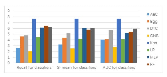 Average Friedman rank value of 3 metrics for 9 classifiers.