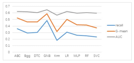 The performance of classifiers is measured by recall, G-mean and AUC, the result of these three metrics are quite similar so we present recall value of classifiers in Table 4. The average values of each algorithm are listed after the result of each datasets, and the average ranks calculated as in the Friedman test are followed with it, the lower the average rank is, the better the classifier is. From recall value of each dataset, we can see clearly that GNB performs better than other basic classifiers in most of the datasets when the size of datasets is around 100 to 1100, and when sample size is larger than 1100, ABC and DTC perform better in most of datasets. Moreover, from the average result in the last two rows in Table 4, GNB attains to the highest average recall value from all datasets but ABC gets the best Friedman rank value among all nine classifiers comparison. We present result of G-mean and AUC together with recall in Figure 4 and Figure 5, the figure shows the similar trend of the three metrics.
