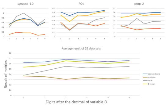As mentioned in Section 3.3, the rank value of informative variable D on features of a sample have a great effect on estimating how informative the sample is, moreover, the precision of variable D affect the rank value directly. Therefore, it is necessary to discuss a proper value of this parameter (precision for variable D). The aim of this discussion is to present the effects of different precision of D on the performance of proposed LIMCR. Considering the space limitation, here, we randomly select the result of three datasets with different sample size (sample sizes of synapse-1.0, PC4, prop2 are 157, 1270, 23014, respectively) and the average result of 29 datasets introduced in Section 3.1. We choose GNB as classifier and evaluate the performance with balancedscore, precision, recall, and G-mean. The value of the precision of D is varied from 0 to 5 with increment of 1. The experimental result are presented as shown in Figure 6.