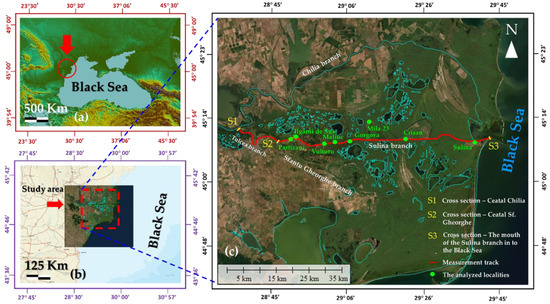 Geographical locations of the settlements along the Sulina branch considered for this study, (a) the study area superimposed on the topographic map; (b) the geographical position of the settlements superimposed on the ortho-photomaps of the Danube Delta (the green dots are the settlements located along the Sulina branch) and the patch on which topo-bathymetric measurements were performed (S1, S2 describe the cross sections measured in the first part of the river, and S3 describes the cross section measured in the river’s second part); (c) the study area superimposed on the digital terrain model.