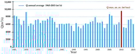 From the analysis of this data, it could be concluded that the most probable value of the average flow over the entire analysis period at the entry point into the delta is between the approximate limits of 6700–6750 m3/s. The data analysis also shows that the maximum annual peak flow was recorded in 2010, a value of 16,600 m3/s, followed by 1970. This can be explained by taking into account variations in average annual flows over time.