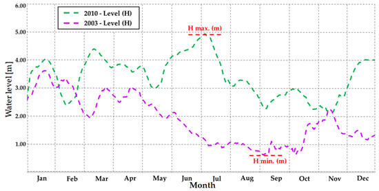 In 2003, the historical minimum water level of the last 20 years was registered in September, due to the warm period of the year and low rainfall. This minimum generally appears most frequently in October, but also in the first and second half of September. The historical minimum water level reached the value of 0.61 m (with reference to the Black Sea at Sulina) and represented a dry year for the Danube Delta. Figure A1 (Appendix A) shows the monthly distribution of the minimum and maximum water levels at the Tulcea-port hydrometric station in 2003 and 2010.