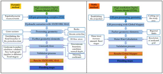 For the analysis of the dam breaching scenarios, two methods were used: the dynamic method for the first scenario, and the static method for the second scenario. The steps followed are summarized in a process diagram (Figure 4).