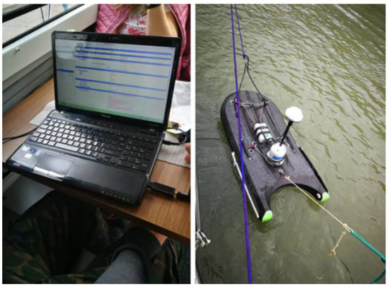 A GPS antenna mounting system was available at the top of the sensor unit. The antenna collects geolocation data so that data recorded by the ADCP sensors was georeferenced. The main unit of the ADCP (console) was also installed on the same floater. It picked up and connected the two signal streams (transmitted by the ADCP sensors and by the GPS antenna), and, through a radio system (transmitter-receiver), communicated wirelessly with the on-board laptop. In this laptop, the control and data collection program from the main unit (console) was running.