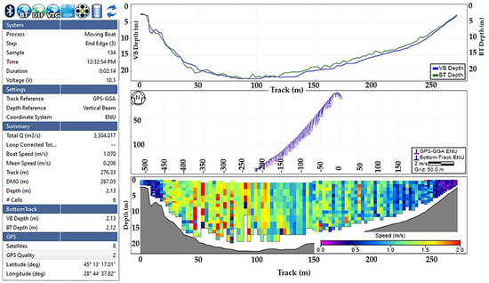 Profile S3 created with the ADCP-profile trajectory, measured parameters (total flow, boat speed, average speed, measured distance, depth) and water velocity graph (velocities distributed on cells, with a colour gradient of velocity intensity, on the water column). The profile was extracted from the River Surveyor Live software (Version 4.1, SONTEK Company, San Diego, CA, USA, 2018) used in the processing of data collected by ADCP.