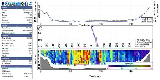 The primary data, measured by ADCP in a cross-section through the riverbed, provided info on water depth (H), the width of the cross-section through the riverbed, measured at water surface level, water flow, and water flow velocities, measured for the entire cross section of the riverbed. Fieldwork for hydrological measurements is presented in Figure 5. Attaching the float to the starboard side of the boat was a necessary condition so that the ADCP sensors were positioned upstream of the boat’s engine. Thus, the data measured by the sensors were not influenced by various parameters related to the boat engine (vibrations, currents induced by the engine propeller, the degree of attenuation of the water flow because of the impact with the boat’s hull, etc.).