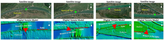 Rupture scenarios (breaches) in the dykes of the settlements Partizani, Ilganii de Sus, Vulturu, and Maliuc: the upper line of subfigures show the location of the breaches on ortophotomap, second line of subfigures shows the breaches in the dyke on DTM representation.