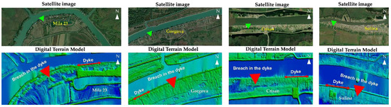 Rupture scenarios (breaches) in the dykes of the settlements Mila 23, Gorgova, Crișan, and Sulina: the upper line of subfigures show the location of the breaches on ortophotomap, second line of subfigures shows the breaches in the dyke on DTM representation.