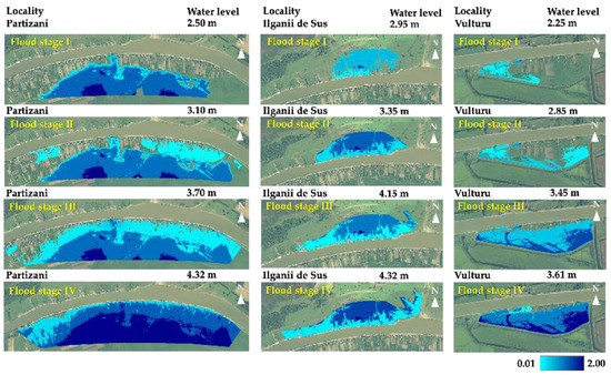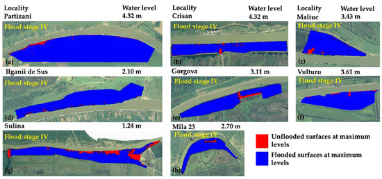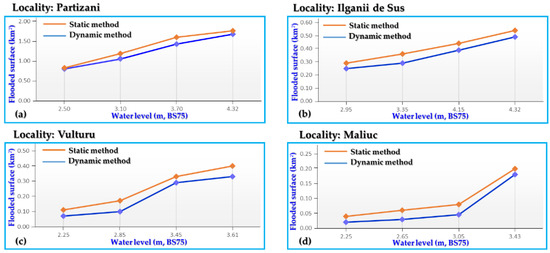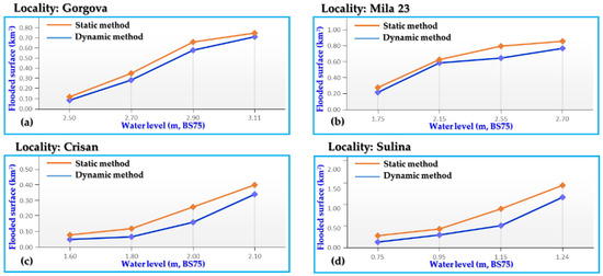 Figure 15 and Figure 16 indicate that the areas flooded under the four flood stages in the static method, varied between 0.85 km2–1.76 km2 (Partizani), 0.29 km2–0.54 km2 (Ilganii de Sus), 0.11 km2–0.40 km2 (Vulturu), 0.04 km2–0.20 km2 (Maliuc), 0.11 km2–0.75 km2 (Gorgova), 0.23 km2–0.86 km2 (Mila 23), 0.08 km2–0.40 km2 (Crișan), and 0.28 km2–1.60 km2 (Sulina).