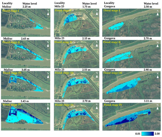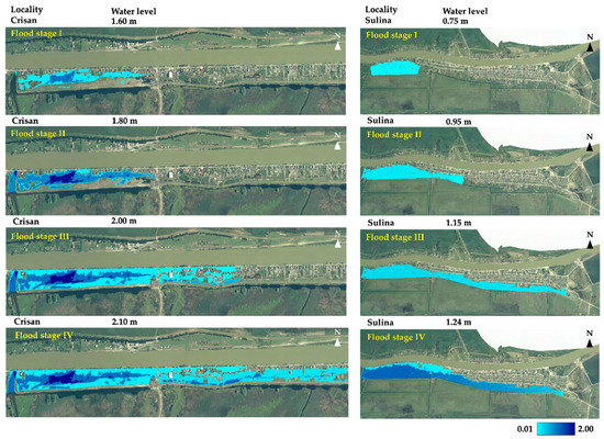 For each settlement, four flooding stages were applied with intervals between 60 cm and 62 cm (Partizani settlement), 17, 40, and 80 cm (Ilganii de sus), 16 and 60 cm (Vulturu), 38 and 40 cm (Maliuc), 20 and 21 cm (Gorgova), 15 and 40 cm (Mila 23), 20 cm (Crișan), and 9 and 20 cm (Sulina). Flooding stages were presented in the Sulina Black Sea reference system and the Black Sea 75 system. Flooding stages were calculated from the lowest flooding level to the highest flooding level for each analyzed settlement. Thus, different flood scenarios of the settlements for different water levels in the river next to them could be visualized.