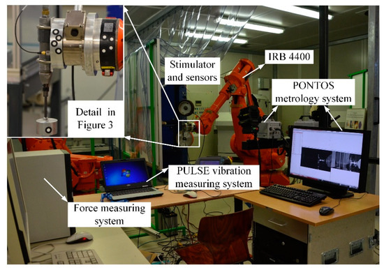The configurations of the forced vibration experiment setup are illustrated in Figure 2 and Figure 3. The setup contains six components: the IRB 4400 industrial robot, the PONTOS metrology system, the PULSE vibration measuring system, the stimulator, the force sensor and the accelerometer.