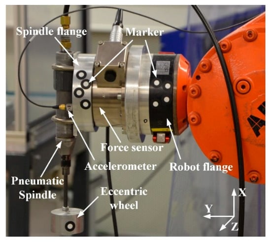 The high-speed camera measuring system used in this work, named PONTOS, is developed by the Gesellschaft fuer optische Messtechnik (GOM). The maximum camera resolution can reach 2048   ×   2048, and the corresponding frame rate can reach 1080 Hz. Based on the triangulation principle, its accuracy can reach 0.001 mm depending on the measuring area. The static position is measured with this metrology system for 7 s to obtain the actual accuracy. The results show that the absolute position accuracy values of the measuring system are X = 0.0016 mm, Y = 0.0019 mm and Z = 0.0051 mm [22]. The Z direction has the lowest accuracy because it is in the direction of the focal depth axis. The metrology system tracks the robot’s motion by identifying a special marker. As shown in Figure 3, markers are attached on the robot flange to track its motion. A measuring frequency (frame rate) of 500 Hz is set to track the vibration displacements. Specified parameters are stated in the table below (Table 2).