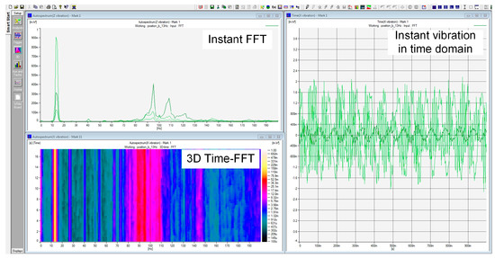 In the experimental modal analysis, PULSE software is used to analyze the FRF with the data from the accelerometer and impact hammer. In this experiment, the software is used to monitor the instant vibration frequency, and obtain the required excitation frequency through regulating the pneumatic spindle. As shown in Figure 4, the PULSE software displays the data in three groups. The right graph shows the instant vibration signal from the accelerometer, which displays the signal in an instant period of one second. The upper left graph shows the fast Fourier transform of the vibration signal in one second. The lower left graph shows the 3D display of the amplitude of the vibration signal in the time and frequency domains. The x-axis is the frequency domain set from 0 to 200 Hz. The y-axis is the total measuring time, and the color contour provides the vibration amplitude. The domain vibration frequency is generated from the stimulator. It is therefore used to monitor the rotating frequency of the pneumatic spindle.