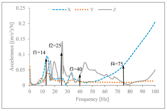 The impact modal tests are carried out based on the settings above. Figure 5 illustrates the FRF H1 in three directions. This shows that the profile of H1 in each direction has its own characteristics. The peaks of the curves, which represent the eigenfrequencies of the robot in each direction, are located at different frequency values. To compare the dynamic stiffness under different frequencies, four frequency values are chosen from low to high. The frequency of f1 = 14 Hz is close to the eigenfrequency of the X and Y directions. The frequency of f2 = 25 Hz is close to the eigenfrequency of the Z direction. The other two frequencies of f3 = 40 Hz and f4 = 75 Hz are away from the eigenfrequency.