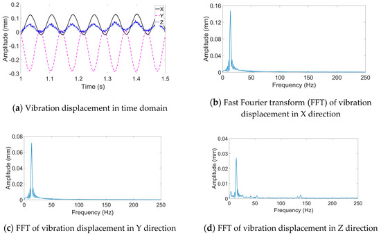 According to the four planned excitation frequencies, the spindle is regulated to each excitation frequency. The vibration data under the condition of a 14 Hz excitation frequency are taken as an illustration of the data processing. The distribution of the forces and displacements are illustrated in both the time domain and frequency domain (Figure 6 and Figure 7). According to the force distributions in the time domain (Figure 6a), the three directions have different force amplitudes. The X direction has the lowest amplitude. This is mainly because the X direction is in the axial direction of the spindle. However, the vibration displacement has the highest amplitude among the three directions (Figure 7a). This is in accordance with the experimental results of the impact modal test, which shows the highest magnitude in the X direction at a frequency of 14 Hz (Figure 5). As the pneumatic spindle does not rotate as stably as the electrospindle, high-frequency noise can appear in the excitation vibration. Through fast Fourier transform (FFT), the vibration distribution in the frequency domain shows a high-frequency vibration at approximately 100 Hz (Figure 6b). However, the values can be ignored compared to the dominant vibration amplitude. As the spindle is manually controlled, it is difficult to set the same excitation frequency as the planned value. FFT shows that the excitation frequency is located at a frequency of 13.43 Hz. For this reason, the calculation uses the practical excitation frequency obtained from the FFT of the vibration data. Compared to the force data, the vibration displacements have much less noise. As shown in Figure 7a, noises appearing in the Z direction, which is in the direction of the focal depth axis, mainly come from the measuring system itself. Because of noise in the vibration, the peak value of the dominant excitation frequency is used to calculate the dynamic stiffness K e (Equation (6)). F e in the equation is the excitation force, and D e is the amplitude of vibration displacement.