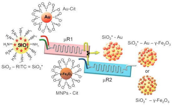 - Hassan, N.; Cabuil, V.; Abou-Hassan, A. Continuous Multistep Microfluidic Assisted Assembly of Fluorescent, Plasmonic, and Magnetic Nanostructures. Angew. Chem. Int. Ed. 2013, 52, 1994–1997. [Google Scholar] [CrossRef]