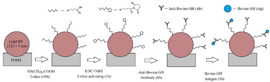 - SadAbadi, H.; Badilescu, S.; Packirisamy, M.; Wüthrich, R. Integration of gold nanoparticles in PDMS microfluidics for lab-on-a-chip plasmonic biosensing of growth hormones. Biosens. Bioelectron. 2013, 44, 77–84. [Google Scholar] [CrossRef] [PubMed]
