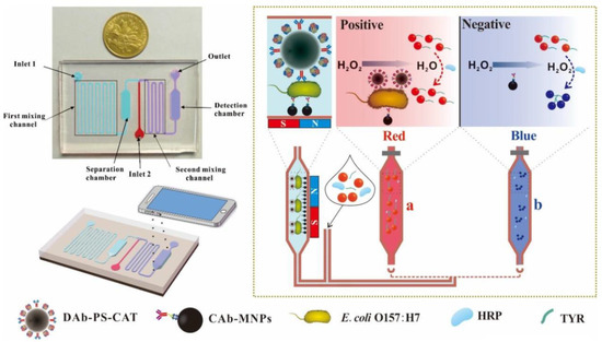 - Zheng, L.; Cai, G.; Wang, S.; Liao, M.; Li, Y.; Lin, J. A microfluidic colorimetric biosensor for rapid detection of Escherichia coli O157:H7 using gold nanoparticle aggregation and smart phone imaging. Biosens. Bioelectron. 2019, 124–125, 143–149. [Google Scholar] [CrossRef]