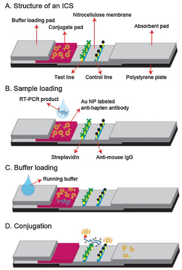- Nagatani, N.; Yamanaka, K.; Ushijima, H.; Koketsu, R.; Sasaki, T.; Ikuta, K.; Saito, M.; Miyahara, T.; Tamiya, E. Detection of influenza virus using a lateral flow immunoassay for amplified DNA by a microfluidic RT-PCR chip. Analyst 2012, 137, 3422. [Google Scholar] [CrossRef] [PubMed]