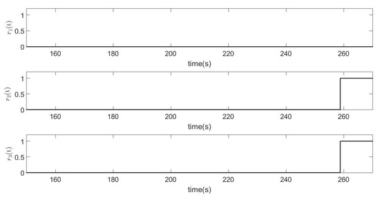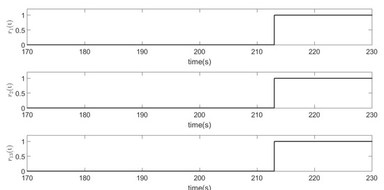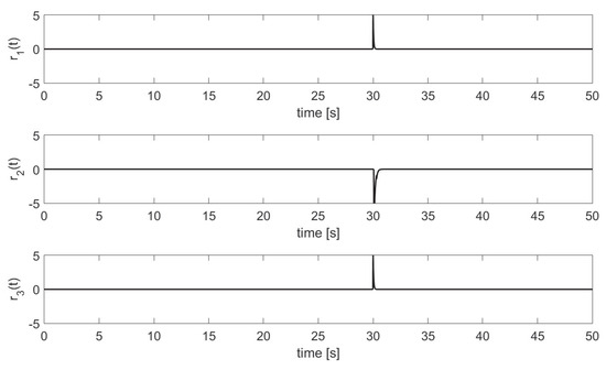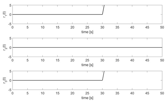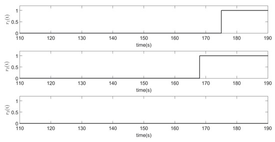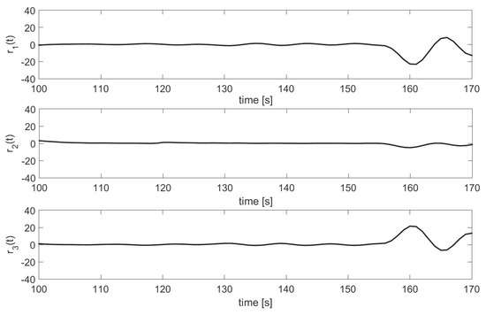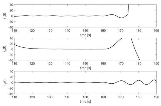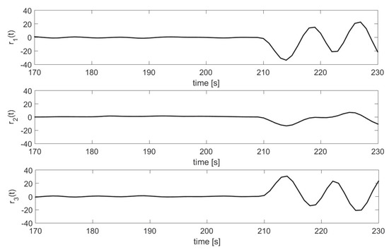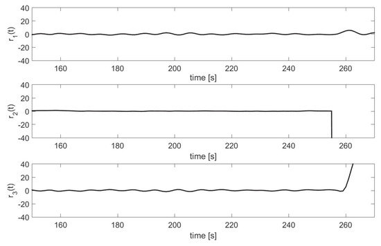 The threshold of the normalized residual evaluation is presented in each of the cases in which the faults occur. The threshold for sensor failure is and the threshold for actuators failure is , these values were chosen based on the structure and dynamics of the decoupled equations.