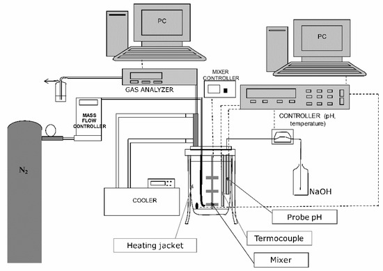 The fermentative processes of the substrates contained in the winery effluent were studied, performing three different series of batch tests. At the beginning, in order to study the contribution of the main pollutants contained in the winery effluent, glucose and fructose were fermented separately by the acclimatized culture. After studying, the fermentation of these two substrates, a series of batch tests was performed upon the synthetic winery effluent. All the batch test were carried out in an SBR of 3 L capacity (2 L working volume of the liquid phase and 1 L working volume of the gas phase), using the acclimatized biomass at 26 °C and pH 5. A schematic design of the experimental setup used in this work is presented in Figure 1.