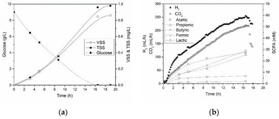 (a) Substrate consumption, biomass growth, expressed as volatile suspended solids (VSS) and total suspended solids (TSS). (b) Hydrogen and short-chain fatty acid (SCFA) production during glucose fermentation.