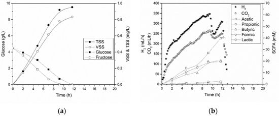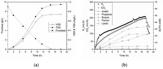 (a) Substrate consumption, biomass growth, expressed as VSS and TSS. (b) Hydrogen and SCFA production during fructose fermentation.