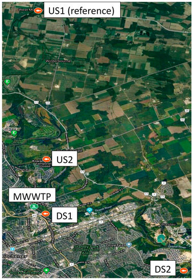 - Nikel, K.E. Wild Fish Responses to Wastewater Treatment Plant Upgrades in the Grand River, Ontario. Master’s Thesis, University of Waterloo, Waterloo, ON, Canada, 2020; pp. 1–93. [Google Scholar]