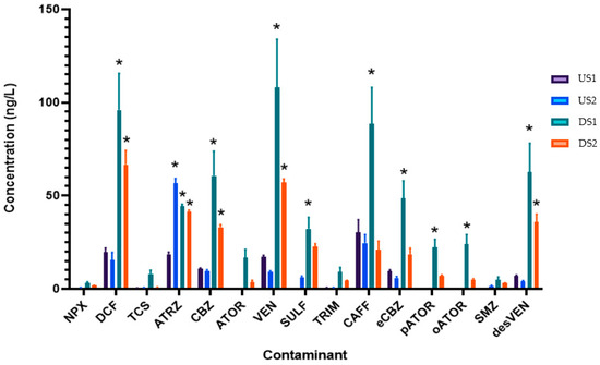 Pharmaceuticals and contaminants measured in the Grand River in summer 2019. Data are presented as mean ± SEM (n = 3 per site). Concentrations (ng/L) of many pharmaceuticals and personal care products were detectable throughout the watershed but usually increased downstream from the MWWTP. Abbreviations on the x-axis from left to right: naproxen (NPX), diclofenac (DCF), triclosan (TCS), atrazine (ATRZ), carbamazepine (CBZ), atorvastatin (ATOR), venlafaxine (VEN), sulfamethoxazole (SULF), trimethoprim (TRIM), caffeine (CAFF), 11,12-epoxide carbamazepine (eCBZ), p-hydroxy atorvastatin (pATOR), o-hydroxy atorvastatin (oATOR), sulfamethazine (SMZ), desmethyl venlafaxine (desVEN). US1, upstream 1; US2, upstream 2; MWWTP, municipal wastewater treatment plant; DS1, downstream 1; DS2, downstream 2. An asterisk indicates a significant difference in concentration compared to US1 (Dunnett’s multiple comparisons test, p < 0.05).