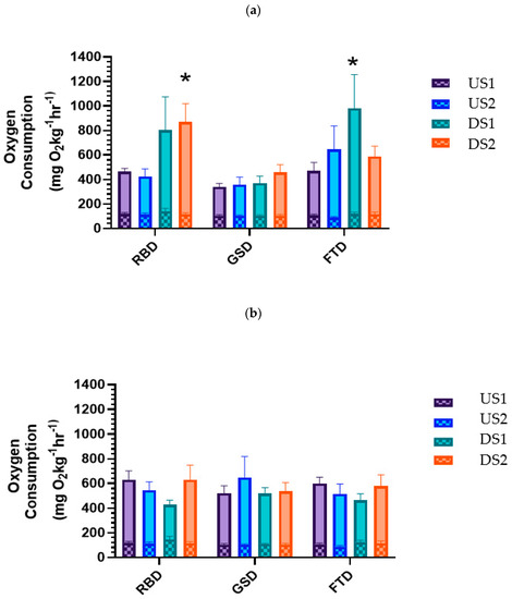 All data passed Levine’s test and the Kolmogorov–Smirnov test (p < 0.05). In summer 2019, the RBDs and FTDs showed significant increases in AS downstream from the MWWTP (Figure 3a). There were no significant changes in FMR, as the increase in AS observed was from an increase in MMR. Values are presented as means ± SEM. In the RBDs, there was a significant 2.2-fold increase of AS (mg O2/kg/hr) at DS2 compared to US1 (p = 0.0287, n = 14, 10, 10, 14 for US1, US2, DS1, and DS2, respectively). There were no other significant differences, but a trend of increased AS at DS1 (2.1-fold; n.s.). The RBDs’ AS at US2 was 0.9-fold lower than at US1. There were no significant differences in AS for the GSDs (n = 13, 12, 13, 14). The AS of the GSDs was 1.2-fold higher at US2, 1.0-fold at DS1, and 1.6-fold at DS2. The FTDs (n = 11, 11, 11, 13) at DS1 had a significant 2.7-fold increase in AS compared to US1 (p = 0.013). The FTDs’ AS increased 1.8-fold at US2 and 1.5 at DS2, but were not statistically significant. In fall 2019 (Figure 3b), there were no statistically significant differences in FMR, MMR, or AS.