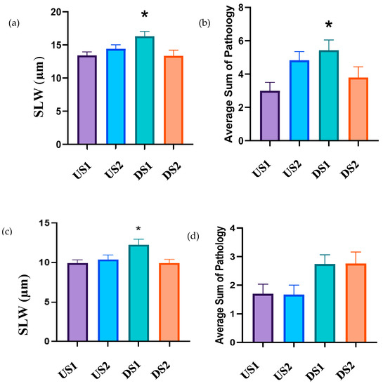 (a) Secondary lamellar width/diameter (SLW) of the RBDs in fall 2013/2014. (b) Pathology scores of the RBDs in fall 2013/2014 (p < 0.05, n = 8, 18, 16, 15). (c) SLW of the RBDs in summer 2019. (d) Pathology scores of the RBDs in summer 2019 (p < 0.05, n = 9, 11, 14, 11). An asterisk represents a significant difference compared to US1 using a one-way ANOVA and Dunnett’s multiple comparisons test. RBD, rainbow darter; US1, upstream 1; US2, upstream 2; DS1, downstream 1; DS2, downstream 2.