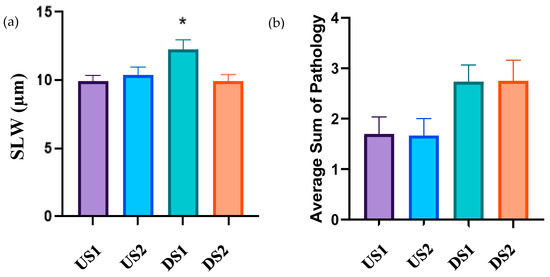 (a) The average SLW of the GSDs in summer 2019 (p < 0.05, n = 11, 8, 24, 11). (b) The average pathology scores of the GSDs in summer 2019 (p < 0.05, n = 11, 8, 24, 11). An asterisk represents a significant difference compared to US1 using a one-way ANOVA and Dunnett’s multiple comparisons test. GSD, greenside darter; US1, upstream 1; US2, upstream 2; DS1, downstream 1; DS2, downstream 2.