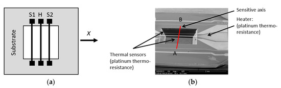 Figure 1) includes a heating element H that creates around itself a symmetrical thermal field. The thermal sensors are located on opposite sides of this element.