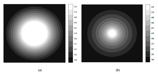 Figure 4 illustrates temperature isolines for stationary heat transfer problem in circular annulus with different ratios between inner and outer radii, which are in good accordance with the solution (40). Only 36 basic functions were taken with centers in knots of the square regular mesh. Numerical integration was realized by the two-dimensional method of trapezoids on the regular rectangular mesh of 32 × 32 nodes.