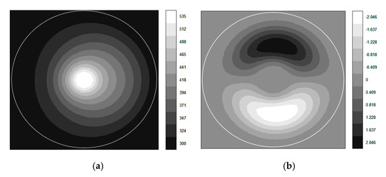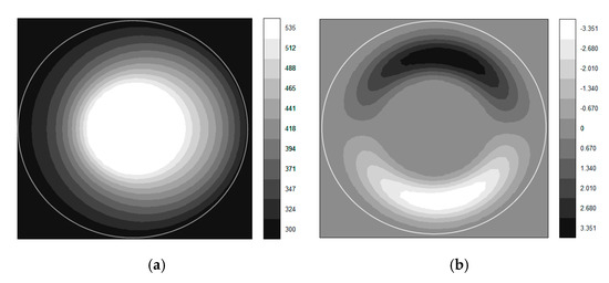 It observed a good correspondence between the results obtained by means of our semi-analytical approach on the base of MQ-RFM and representation (41) (within the restrictions imposed on the asymptotic solution: the inner cylinder radius and the temperature difference should be small enough). Our method demonstrated a very high rate of convergence. For example, in the case , the relative error between approximate and analytical solutions became less than after only two iterations. Here, , , with relative errors between and respectively as compared with those evaluated with using expression (41) which gives us .