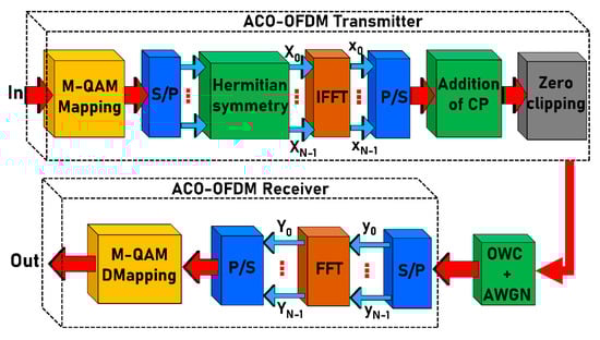 A schematic of the ACO-OFDM encoder–decoder system is shown in Figure 1.