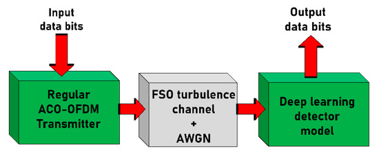 DL is a neuron system model that maps input to output data through a graph that contains several layers. The input data are data with noise after passing through a specific system. The output of the DL system is the original data that the DL wants to detect. Each layer maps the data through nodes, where the first layer is the input data. Each layer depends on the value of the nodes in the previous layer after passing an activation function. DL tries to optimize the performance of the system through two stages. The first is called the training process, and the second is called the prediction process. At the beginning of the training process, the DL system model sets random values to the weights, which are the connections between the nodes in each of two consecutive neighboring layers, and then it changes the weights of the DL model by a gradient descent method in a number of iterations until it reaches the minimum loss between the output of the DL system and the original output. Then, after the training process, the system saves the final weights with the minimum loss and then starts an online process called the prediction process. In this process, the system receives online data and detects the original data, depending on the weights that were saved in the previous process. In recent years, many researchers have used DL for improving the performance of a system in many fields, including speech recognition, wireless communication, optical wireless communication, etc. In [23], we successfully used DL for improving the performance of OOK modulation over different FSO turbulent channels. The received data are a corrupted version of the data after passing through turbulence, and the output data are the original data bits that we want to detect. Here, we want to use the same concept as in [23], to improve the performance of modulated ACO-OFDM signals. We know that this modulation is similar to OOK but is more sophisticated. In both modulation systems, the DL system receives modulated data after it has passed through a turbulent channel with noise and is required to recover the original data bits. In this section, we propose a new DL detection method for ACO-OFDM for FSO communication to enable its use over different turbulent channels and to improve the performance of the FSO communication system when the channel is characterized by strong turbulence or is variable, without the need to know anything about the parameters of the channel. The system of our model is presented in Figure 2.