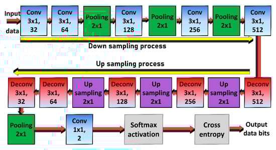 In the second model, we use FCNN. The concept is taken from [11], where it is proposed for image segmentation, which means determining whether each pixel in the output image is foreground or background. We used FCNN because the aim of our network is to make a semantic segmentation for each output bit. FCNN includes two processes, a down-sampling process and an up-sampling process. The down-sampling process comprises a number of convolutional and pooling layers used to detect high-resolution information in the image. The up-sampling process is the inverse process of the down-sampling process and comprises a number of de convolutional and up-sampling layers, which are used to extract the precise localization of the extracted data after the down-sampling process. The output layer of the system is a convolution layer that contains two channels: one channel predicts if this pixel is background, and the other predicts if it is foreground. In our FCNN model, we used the concept in [11], but we changed it to be suitable for our problem. Our FCNN model receives input vectors with noise and performs a number of operations on this input vector by two processes, as in the FCNN models: a down-sampling process that comprises a number of convolutional layers with pooling layers in order to interpret the data and then to know the precise localization for the data extracted by the up-sampling process. In the down-sampling process, we used convolutional layers of 32 filters, each of size 3 × 1, and then we used four convolutional layers with filter sizes 64, 128, 256, and 512, each filter of size 3 × 1, between each two layers. We down-sampled the size of the data by pooling. After this process, we used an inverse process of four deconvolutional layers with sizes 512, 256, 128, and 64 filters. Each filter is of size 1 × 3. We up-sampled a 1 × 2 layer between each two deconvolutional layers, as shown in Figure 4. After each internal layer, we used a relu activation layer, as given above in Equation (12), with batch normalization. After these two processes, we used a pooling layer followed by a convolutional layer of two filters, each one of size 1 × 1. We apply softmax activation as in (13) and use a cross-entropy loss process to obtain the minimum loss between the original data and the output of the DL system as in (14). At the outputs of our systems, we get two values of accuracy and loss. The model trains over a number of iterations until we obtain results with maximum accuracy and minimum loss. The BER is calculated as BER = 1 ACCURACY , and   ACCURACY is the ratio of number of correct predictions to the total number of input samples. Performances of the DL decoder and the regular ACO-OFDM decoder that used the MMSE estimator are compared. In the next section, we present the results of our proposed DL models and compare them with the results of the ACO-OFDM decoder that uses the MMSE estimator.