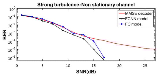 The BER performance results of our DL models compared with the regular ACO-OFDM decoder system when the channel is with fast fading and non-stationary are presented in Figure 5 for strong turbulence.