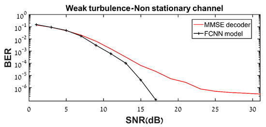 In Figure 6 and Figure 7, the red curve represents the BER performance of the regular ACO-OFDM decoder using the MMSE estimator, and the black curve represents the results of our FCNN model. We see that our FCNN DL model yields performance very close to that of the MMSE estimator when the channel is stationary with weak turbulence or with strong turbulence. However, the advantages of our DL models are clearly shown in Figure 8. When the channel is characterized by weak turbulence and is non-stationary with fast fading, the regular ACO-OFDM decoder using the MMSE estimator does not succeed in recovering the corrupted data. Since for the same BER this method requires higher SNR, it consumes much more energy compared to our DL models, which succeed in recovering the data with less energy consumption and manage to decrease BER by more than 8 dB. For example, when the SNR is larger than 25, the regular ACO-OFDM decoder yields a BER performance equal to 10−6 and does not achieve a lower value than this, even at higher SNR. However, in our FCNN DL model, when the SNR is 17 dB, we succeed in getting BER performance equal to 10−7, and with this SNR, we recover the transmitted data without errors. In other words, we get a BER equal to zero.