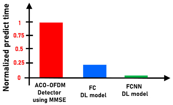 In addition to this, another advantage of our DL models is that they are faster than the regular ACO-OFDM decoder. The prediction time of our DL models after the training process is faster than that of the regular ACO-OFDM decoder, as shown in Figure 9.