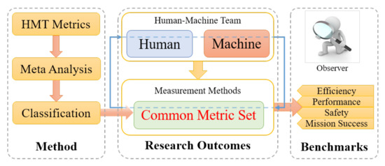 While the foundations of HMT were laid at Defense Advanced Research Projects Agency (DARPA) in 2001 [54], it took five years more for the research community to identify a set of metrics that facilitates a well-organized structure of human robot interactions (HRI). For many metrics, we found close but different descriptions of the same metric, primarily for HMI in human-robot or robot-only swarms [55,62]. Identifying common metrics will allow benchmarking of HMT designs, comparison of findings, and development of evaluation tools. The primary difficulty in defining common metrics is the diverse range of HMT applications. Here, we focus on metrics for all three agents of HMT, i.e., human, machine, and team. The goals of this section are (1) identification and classification of metrics, (2) evaluation of the identified metrics to find common metrics, and (3) proposal of common metrics that can be used in future HMT benchmarking.
