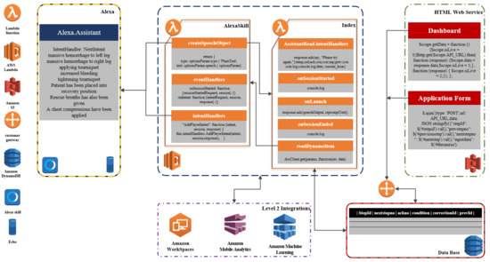 A voice-based SA uses voice interaction as the primary communication mode, and communication with it occurs under the human-based task. The VBSA has been developed to follow major medically approved emergency protocols such as massive hemorrhage, airway blockage, respiration, circulation, hypothermia and eye injury (MARCHE) and airway, breathing, circulation (ABC) [43,44]. This is done to train emergency care providers (ECPs). The developed assistant tracks the training progress of the ECP in real-time and helps the ECP to correct the errors committed, with predefined steps in addition to a timely warning. The SA’s secondary role is to provide an ECP with the job details required and to maintain a record of the training results, including the total number of errors and frequent errors as well as the execution time. After reviewing 29 existing autonomous systems, the architecture of the VBSA has been developed with a combination of a natural language processor (NLP), a speech synthesizer (SS) and primary operation blocks (data pre-processor, scenario calculator, process monitor, result synthesizer and data post-processor). The developed SA technology is integrated into Amazon Web Services (AWS) with respect to language features and micro-services available. Ref. [8] states that Alexa Voice Services (AVS) uses both NLP and SS and can be accurately trained for different accents. The database was developed and stored in Amazon DynamoDB, and the primary operation blocks (scenario calculator, process monitor, result synthesizer) were developed in AWS Lambda. Users can access the VBSA using either the Echo smart speaker or the Amazon Alexa mobile application. In our process, the user’s performance and the SA were tracked using a dashboard projected on a screen. The errors made during the communication, along with step numbers, were displayed on the dashboard for correction later. A detailed discussion of the tracking process has been discussed in our previous paper [8]. The detailed version of the VBSA architecture and development process has been inspired by our previous research on HMT [8,45,46,47]. Figure 4 presents modes of operation of the VBSA, while Figure 5 presents the Unified Modeling Language (UML) diagram of the VBSA architecture depicting the AWS components that were used to develop the cloud-based IA. VBSA was developed as a cloud-based architecture using AWS because, according to [48], cloud architectures are easy to develop, scale, and deploy. However, this is at a tradeoff of significant delays in the system response based on network and communication protocols, which in turn may affect the performance of the VBSA.